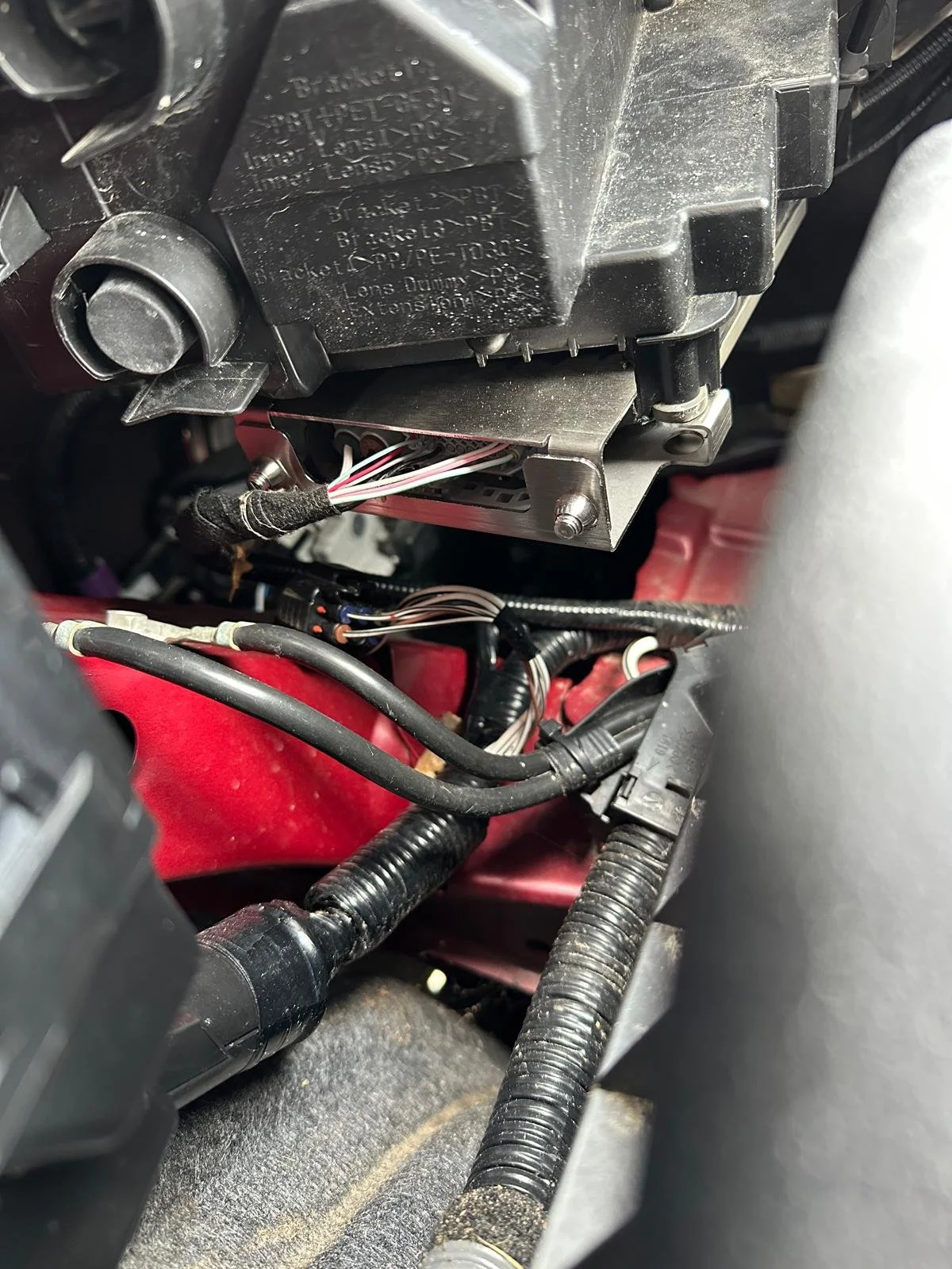 Here you can see the metal security cage fitted to one of our customers’ vehicles. The cage is bolted in from the front side, making it difficult to remove, especially through access from the wheel arch. The cages prevent thieves from simply disconnecting the connector to plug in their own hardware. The plastic you see above this cage is the headlight housing, where we’re looking at the back of the headlight here.